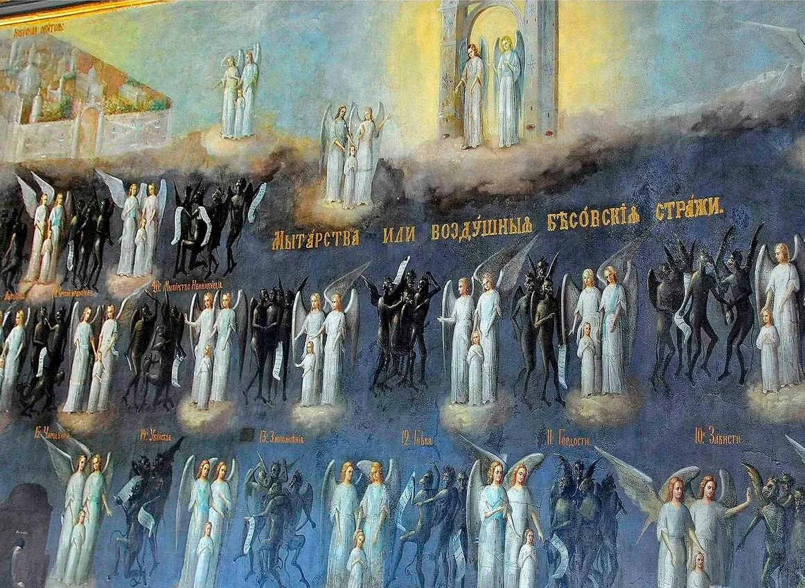 Навіть Божа Матір, Пресвята Богородиця, достойна більшого вшанування, ніж Херувими, і прославлена вище Серафимів, яка носила в Собі Переможця аду і смерті, тремтить в очікуванні бісівського суду, як запевняє одна з легенд про митарства: