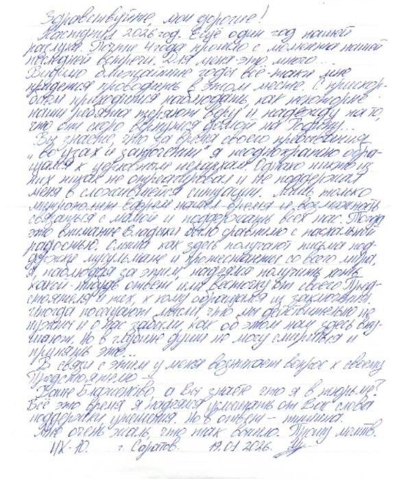 You know that during my time ‘in chains and imprisonment’ I have repeatedly appealed to church hierarchs. However, none of them has responded in any way or supported me in this situation. Only Metropolitan Ephrem found the time and opportunity to contact my mother and to support all of us. At that moment, the bishop’s attention was comparable to the joy of Easter. Hearing how Muslims and Protestants here receive letters of support from all over the world, I watched and hoped to receive at least some response or a brief word from my Primate and from those to whom I appealed from prison. At times, thoughts arise that we truly are not needed and that we have been forgotten, as they try to instill in us here. Yet deep in my soul I cannot come to terms with this or accept it…